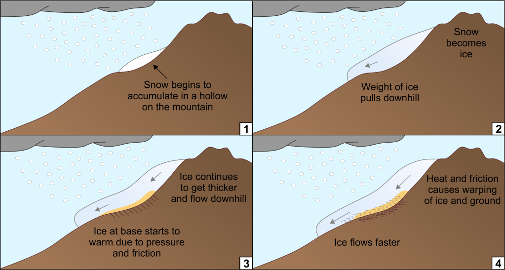 Ice sheets form high up in mountainous areas, on slopes. Gravity is trying to pull it down the slope as soon as it starts to form. Eventually the mass of ice is big enough that it will start to slide. As it gets bigger, the weight creates pressure and ice at the base of the ice sheet starts to soften and warp. At the same time, the ground underneath the ice is also placed under huge amounts of pressure and, in a very similar way, will start to deform also. This allows the ice to flow more easily.