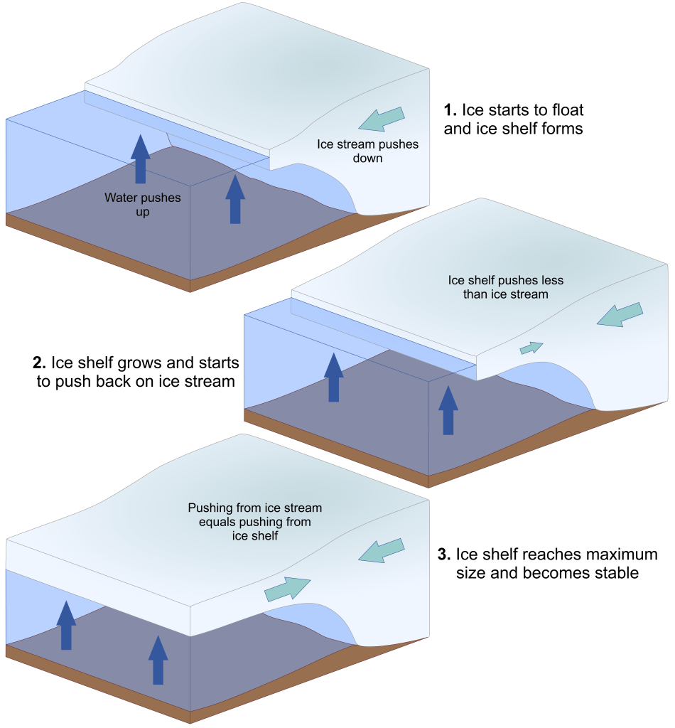 The existence of ice shelves protects the ice sheets. The flow of ice slows down when it reaches water. This is because the buoyancy of the ice on the water counters the pull of gravity. The only thing pushing an ice shelf further out into the water is the ice behind it, flowing down from the land.