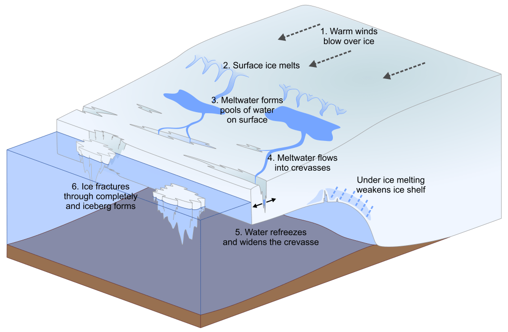 Warming of both the sea and the air around ice shelves can cause iceberg calving to increase. The warm winds which cause most melting become more common and, in turn, cause more meltwater to flow into crevasses. The calving of ‘mega’ icebergs is strongly associated with years that are particularly warm and windy. In the most extreme cases, the ice shelf becomes so unstable from the number of crevasses that it shatters like glass.