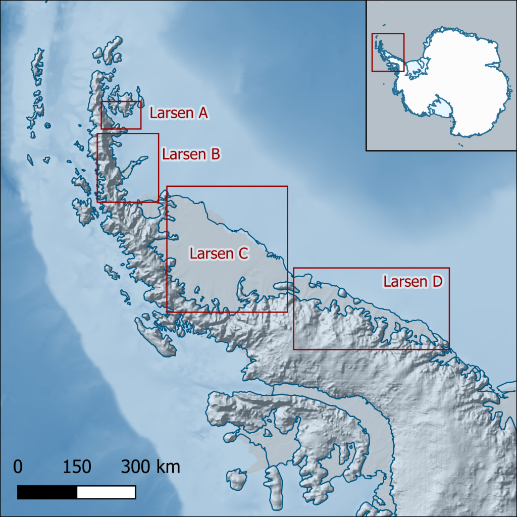 Larsen B covered an area about the size of Luxemburg. It had existed for at least 12,000 years. Immediately after Larsen B collapsed, ice that had been flowing into the ice shelf started to speed up. The warming of the Weddell Sea area over the last few decades means that the ice is melting faster than a new ice shelf can be formed.