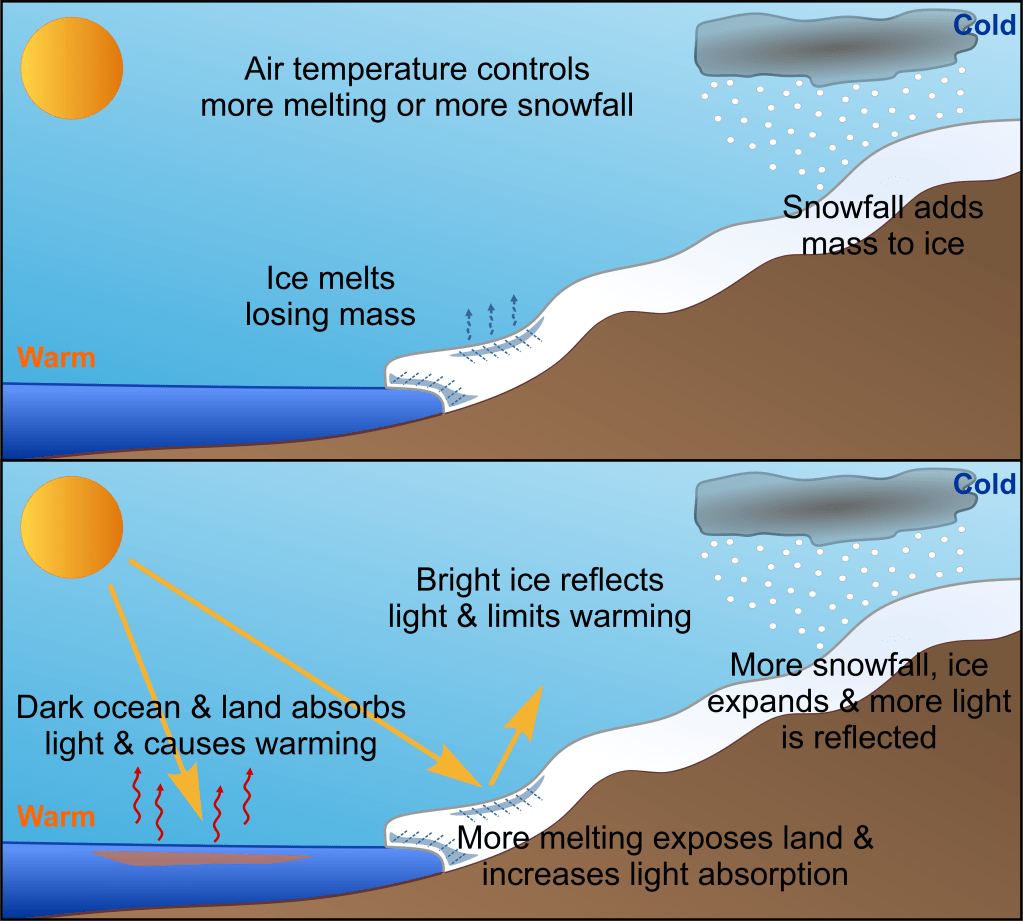 The broad relationship between global temperature, ice cover and sea level is relatively straight forward. It combines average surface temperature, the melting rate of ice compared to how much snow is falling on the ice and what’s called the albedo effect. That is how bright the land surface is. Brighter land surfaces reflect light with a minor cooling effect and duller or darker surfaces absorb light producing more heat. With less ice more dark land area is exposed and more heat produced from light absorption.