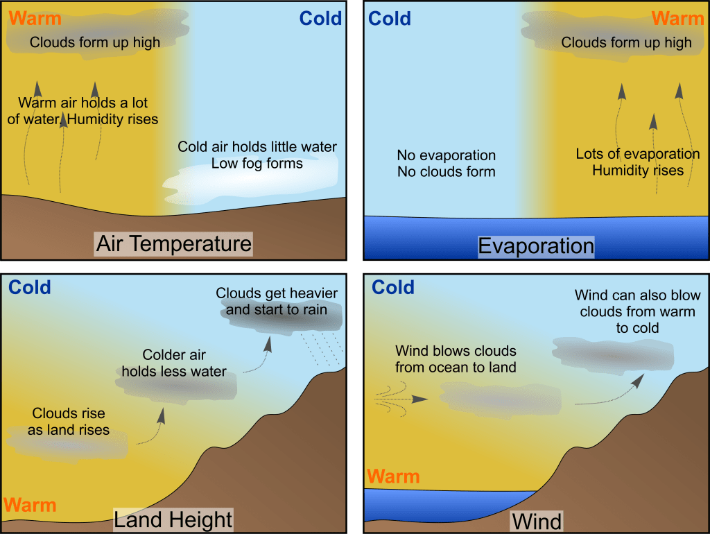 For example, say scientists want to know how a warming trend in global average surface temperature affects rainfall. The amount of rainfall is controlled mainly by the temperature of the air, how much evaporation is taking place, the height of the land, which way the wind is blowing and how strongly. Of these, the global average surface temperature strongly affects the air temperature and evaporation, with a smaller impact on wind direction and speed.