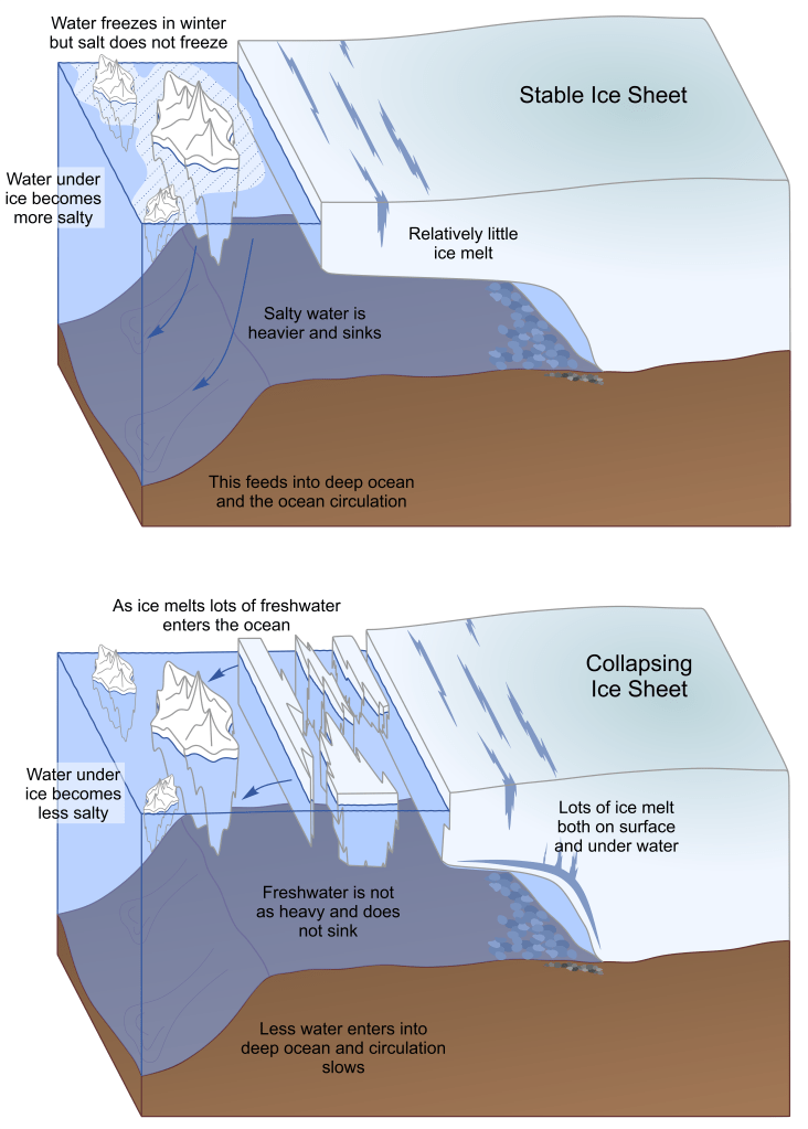 Finally, there are certain outcomes that are very unlikely to happen, but if they do, they will cause massive changes that the IPCC cannot fully model. This includes things like the shut-down of parts of the ocean circulation system, which they do not expect to happen before 2100, but could if there was a massive influx of freshwater into the ocean. Say, for example, from an ice sheet collapsing. If there was a partial shut-down of the ocean circulation system, it would change weather patterns, the water cycle, biodiversity in the oceans and the amount of fish stock for fishing.