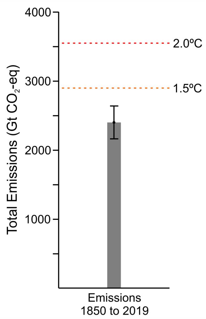 The way the IPCC calculates this is using a carbon budget. This is the amount of carbon dioxide, or the equivalent amount of non-CO2 greenhouse gases, we can release to keep warming to a certain level. The approximate amount of total emissions to bring the global temperature from the 1850-1900 average to 1.5˚C above the average is 2900 Gt CO2-eq (giga-tonnes of carbon dioxide equivalent). As of 2020 historical total emissions reached around 2400 Gt CO2-eq. That means we have used four fifths of the total carbon budget.