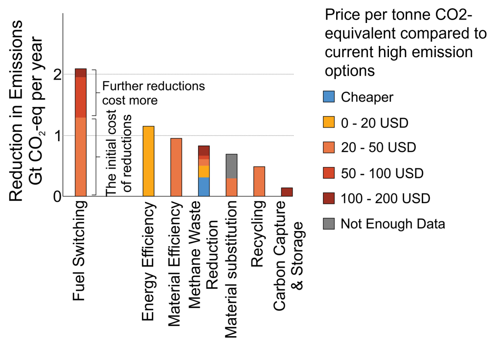 For example, light industry and manufacturing can largely cut emissions through improving material efficiency, electrification of their infrastructure and switching to low emission fuels such as hydrogen, biofuels or synthetic fuels. Even the most expensive of these options, which is switching fuels, is only up around 50-100 US dollars more expensive than the current option per tCO2-eq (tonne of carbon dioxide equivalent) reduction. Given the likely costs of climate change due to supply chain and operation problems in extreme weather, this seems like good value.