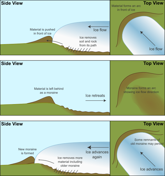 Knowing this, if you see a set of terminal moraines in the landscape, lying next to one another like a set of ribs, we can predict that this is showing the persistent retreat of an ice sheet. The ice sheet started at the moraine that is at the furthest extent and retreated back and back again, pausing and creating new terminal moraines, but never growing. If it had grown, the terminal moraines it had previously lain down would have been destroyed.